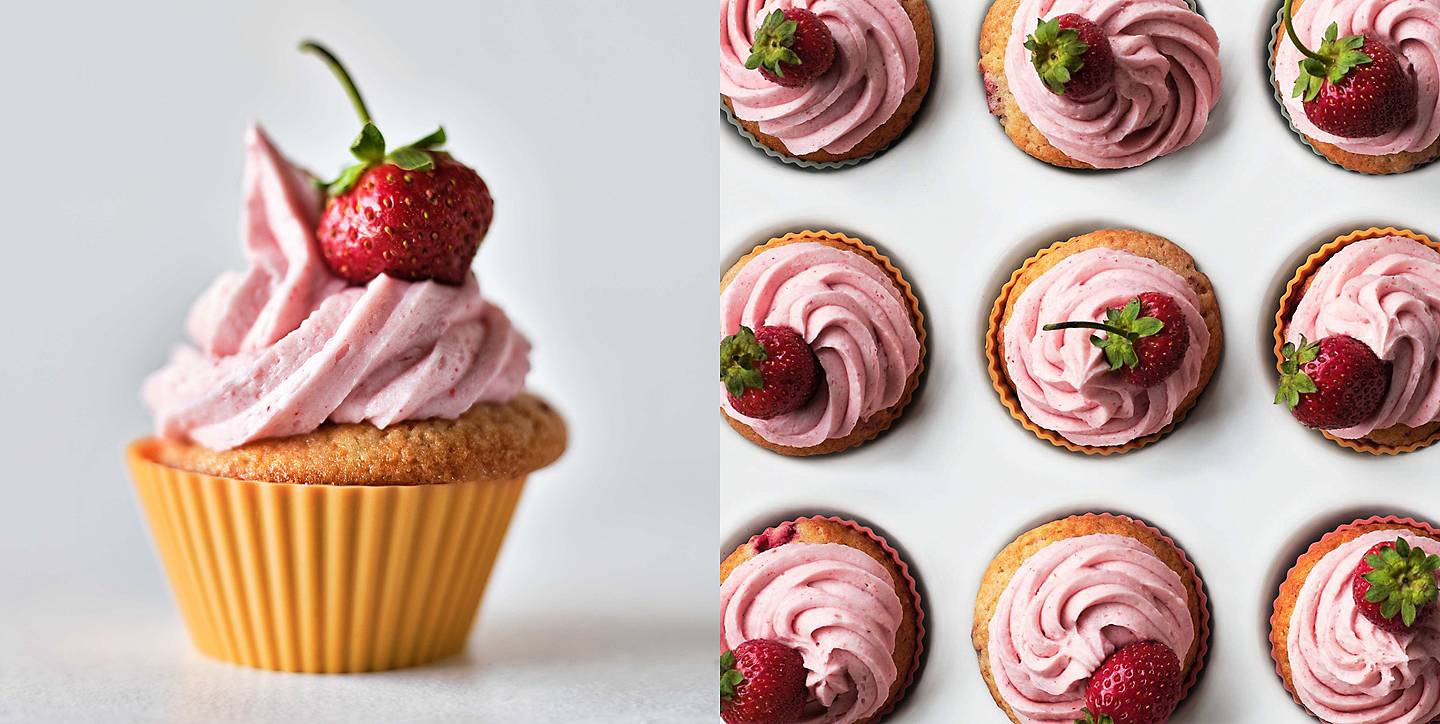Estos cupcakes son una opción dulce y suave, con una masa esponjosa que incluye trocitos de fresa. El glaseado cremoso, con su tono rosado y sabor frutal, los convierte en un postre llamativo y muy tentador para compartir en cualquier momento.