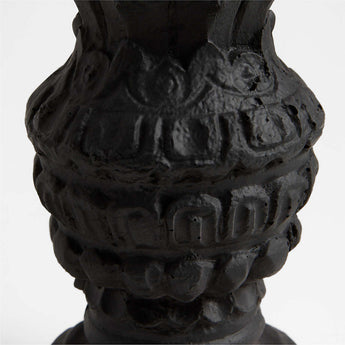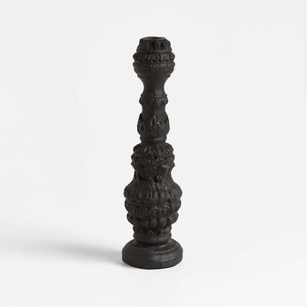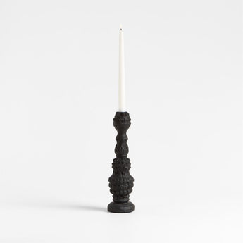Inspirado en una columna encontrada intrincadamente tallada, este pequeño portavelas llama la atención por su altura, su acabado negro mate y su textura rústica. Hábiles artesanos pintan cada uno a mano, dando al candelabro de fibra de vidrio fundida y resina el aspecto de un artefacto tallado en bruto. Estamos obsesionados con el dramatismo que aporta el acabado de falso carbonizado a una mesa de comedor o una repisa de chimenea.