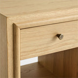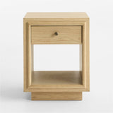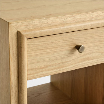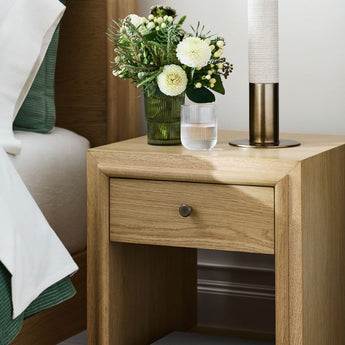 La discreta elegancia de nuestra mesilla de noche Hastings permite que brille la belleza del roble natural. Colocada sobre un zócalo empotrado, la mesilla de noche rectangular está enmarcada sencillamente con molduras redondeadas y de inglete nítido que mantienen la mirada fija en el veteado recto pero pronunciado y la rica coloración de la madera. La mesilla de noche tiene el tamaño perfecto para los dormitorios más pequeños y, al mismo tiempo, ofrece mucho espacio de almacenamiento con un cajón y un estante abierto.