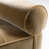 Elegante lugar de reposo, este sofá-cama también constituye un llamativo asiento de ventana o separador de ambientes. Inspirado en el diseño Art Déco de los años 30, el sofá cama de proporciones perfectas contrasta el terciopelo afelpado con una base de madera. La gruesa base de zócalo cimenta la pieza en chapa de walnut bellamente veteada y con acabado natural. Alargado y lineal, el asiento de terciopelo verde oliva está rematado por cojines cilíndricos abrochados y confeccionado con capitoné de botones por toda la superficie.