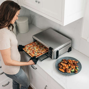 Este horno de encimera no sólo asa, hornea, asa, tuesta, deshidrata y calienta, también fríe donuts de manzana, patatas fritas de boniato o alitas de pollo con poco aceite. La freidora de aire incorporada utiliza calor y flujo de aire controlados con precisión para crear un crujiente óptimo. Gracias a su espacioso interior, este aparato compacto puede hornear rápida y eficazmente 6 pechugas de pollo, tostar 9 rebanadas de pan o cocinar una pizza de 13". Al plegarse verticalmente contra su salpicadero cuando no está en uso, este horno de aire frito ofrece ocho opciones de cocción en un aparato que ocupa poco espacio.
