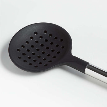 Remueva, recoja y sirva albóndigas, pasta y guisantes con nuestra característica cuchara ranurada de silicona negra y acero inoxidable. Fabricada con un núcleo de nailon para mayor resistencia, la cuchara ranurada tiene perforaciones que permiten que los líquidos se escurran. La silicona suave al tacto no daña las sartenes antiadherentes y resiste las manchas, los arañazos y el calor hasta 600 grados. El acero inoxidable pulido da forma a un elegante mango cilíndrico para un agarre firme y un aspecto profesional. Nos encanta la forma en que el refinado borde biselado remata el mango alargado con un detalle dinámico. Combine la cuchara ranurada apta para lavavajillas con los demás utensilios de exquisitas proporciones de nuestra exclusiva colección Crate & Barrel para tener un espacio de trabajo bien equipado a la altura de cualquier reto culinario.