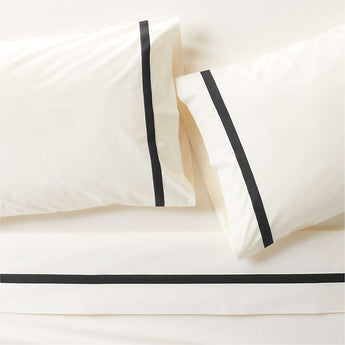 Nuestra colección de ropa de cama de percal para hoteles lleva a casa la indulgencia de una escapada de lujo. Inspiradas en los esmóquines atemporales, las rayas negras bordadas detallan el juego de sábanas marfil. El pespunte satinado contrasta con el percal de algodón orgánico crujiente y cremoso para unas sábanas de aspecto sofisticado y tacto irresistiblemente cómodo. Combínelas con la funda nórdica y las fundas de almohada a juego para crear una cama impecable.