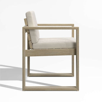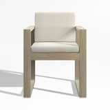 Tablones de madera de eucalipto duradera y de origen sostenible dan forma a la atrevida geometría de Mallorca, mientras que un acabado pintado y cepillado con alambre emula el aspecto de la madera a la deriva erosionada. El respaldo de listones y el conjunto de esta silla de comedor Exterior se apoyan en unas minimalistas patas de trineo que continúan en los reposabrazos. Complementando el fresco acabado, el cojín marfil resistente a la intemperie hace de este sillón de comedor el lugar ideal para disfrutar de comidas al aire libre o tomar el sol con estilo.
