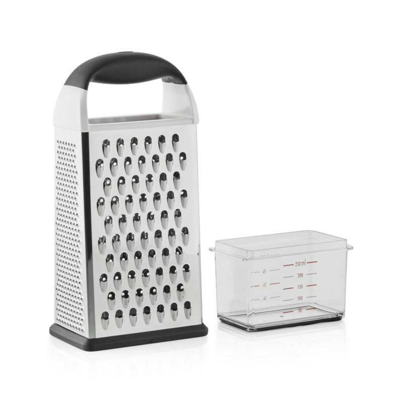 Nuestro rallador de caja cuenta con 4 superficies de acero inoxidable: 2 anchas para rallado grueso y medio y 2 más finas para rallado fino y corte en rodajas. Un práctico recipiente con base antideslizante, marcas de medida y tapa se acopla a la base para recoger y guardar los ingredientes recién rallados.