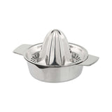 Exprimidor de dos piezas en moderno acero inoxidable que combina la clásica parte superior escariadora con función de colador y la base de doble asa con pico vertedor. Tamaño adecuado para limones, limas, naranjas y pomelos pequeños.