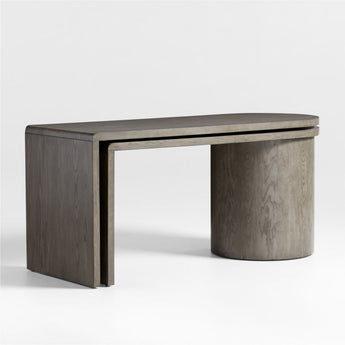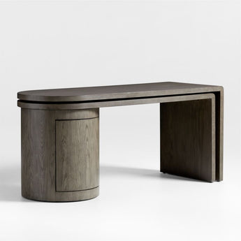 Nuestro asombrosamente versátil escritorio Twist pivota sobre un cubo redondo para servir a una gran variedad de funciones. En su forma compacta, las superficies de la mesa se anidan para crear un escritorio de oficina. Ampliadas, se separan para convertirse en un amplio escritorio ejecutivo o en ángulo como escritorio de esquina. De hecho, el escritorio gira 360 grados, creando cualquier número de configuraciones que se adapten a su espacio. El cubo en forma de tambor tiene una puerta integrada que se abre a un estante fijo para almacenaje. Fabricado en chapa de fresno, el escritorio ampliable tiene un acabado gris que resalta el dinámico veteado de la madera. Un enfoque atrevido para la decoración Muebles de Oficina , el escritorio Twist es una exclusiva de Crate & Barrel.