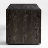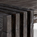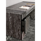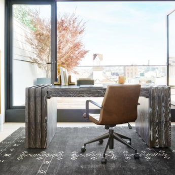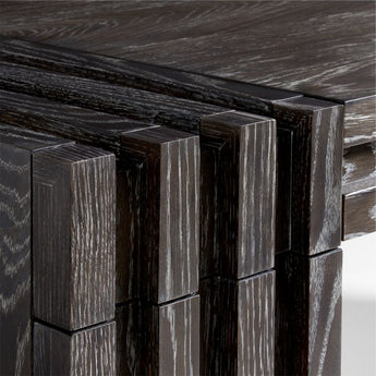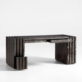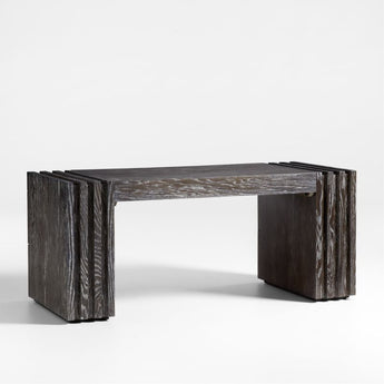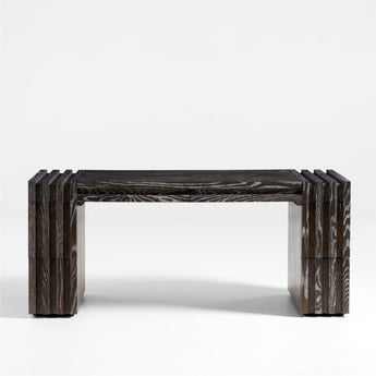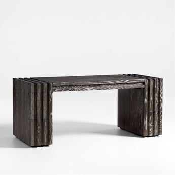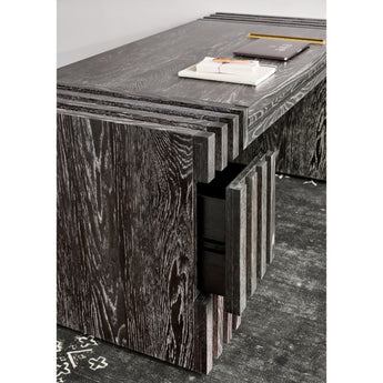 Nuestro escultural escritorio ejecutivo Waylon toma el mando con líneas fuertes y arquitectónicas y un exuberante veteado. Inspirado en las formas monolíticas, el atrevido diseño en cascada se inspira en las columnas estriadas con detalles lineales tallados que ocultan tres cajones en ambos extremos que se integran a la perfección en el diseño. Dos esbeltos cajones bajo la superficie de trabajo están forrados con fieltro negro e incluyen una bandeja tallada para lápices. El tinte chocolate oscuro de tono wengé y el acabado cerusa marfil del escritorio aportan un vivo contraste a las vetas catedral de la madera. Nuestro exclusivo escritorio Waylon eleva el espacio de trabajo doméstico con una forma dramática y una mano de obra exquisita.