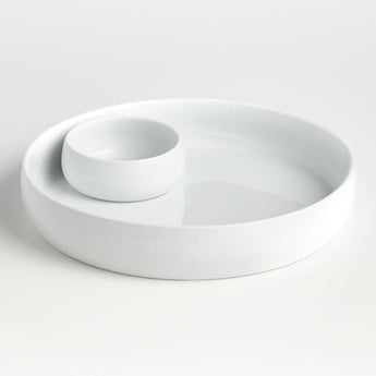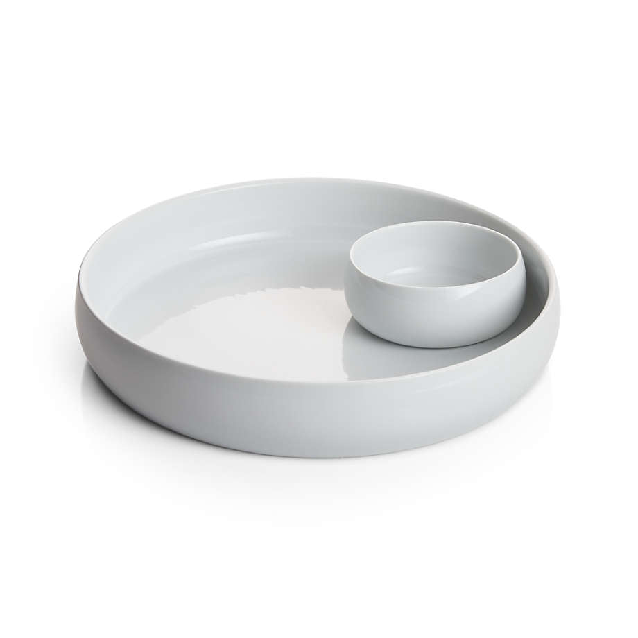 Un diseño exclusivo de Crate and Barrel realizado por el ceramista Bret Bortner, las limpias curvas de este set blanco verdaderamente clásico para patatas fritas y salsas son la esencia de la sencillez para presentar salsas, salsas o hummus con patatas fritas, galletas saladas, gambas o verduras. El diseño de doble cuenco añade versatilidad y facilidad de limpieza.