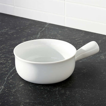 Su estilo de restaurante y su forma sencilla hacen que esta fuente de porcelana para gratinar sea ideal para servir raciones individuales de platos dulces y salados favoritos. Este cuenco con asa esmaltado en blanco sirve sopa de cebolla francesa y sustancioso guiso de calabaza de invierno con un aspecto limpio y clásico. O las patatas gratinadas o el budín de pan boubon directamente en la fuente para una encantadora presentación del horno a la mesa.
