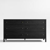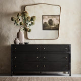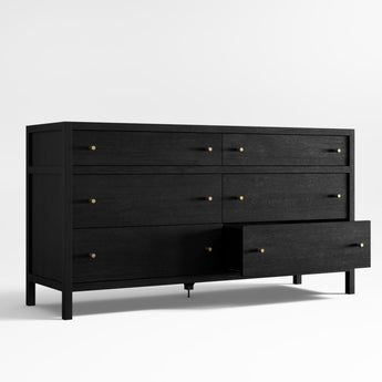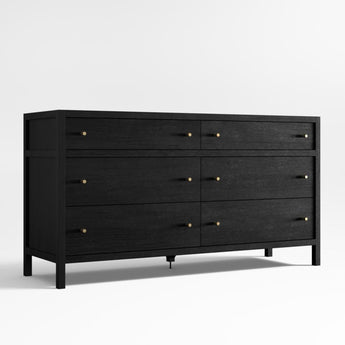 Refinado y audaz, Keane lleva el almacenamiento del dormitorio al siguiente nivel. Diseñada para crear una presencia majestuosa en el dormitorio, cada pieza está fabricada en hermosa caoba acabada con cepillado de alambre y black stain para resaltar las vetas. La espaciosa cómoda baja de seis cajones acentuada con tiradores redondos brass presenta paneles embutidos y detalles en canal que llaman la atención sobre sus líneas limpias y arquitectónicas.