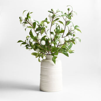 Nuestro tallo falso de arbusto botón anima su decoración con la alegría de los pompones de las flores blancas del arbusto de los pantanos. Enclavados entre las hojas sutilmente onduladas, los frutos verdes esféricos también añaden textura a la rama. El vástago de arbusto de botón es un complemento vivo para cualquier arreglo de plantas artificiales y destaca en uno de nuestros jarrones blancos.