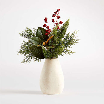 Este festivo ramo de botánicos de imitación anuncia la temporada navideña con racimos de bayas rojas, plumosos aerosoles de ciprés, brillantes hojas de acebo y ramitas de enebro acentuadas con bayas de color gris azulado. Para un acento fácil, ponga el manojo en un jarrón y colóquelo en la repisa de la chimenea, en la mesa del banquete o del comedor. Nuestro ramillete de hojas de ciprés y bayas es una exclusiva Crate and Barrel .