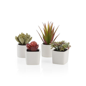 De calidad incomparable y hábilmente elaboradas para parecerse a las auténticas, las tiernas suculentas de imitación en la fase perfecta de crecimiento florecen en macetas limpias y modernas. Los tonos verdes y rosados de cuatro diminutas plantas diferentes resplandecen sobre las macetas de cerámica blanca, aportando un acento vivo a cualquier rincón de la casa. Agrupe las plantas o distribúyalas por toda la casa, o regale suculentas individuales como dulces obsequios para los anfitriones.