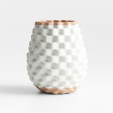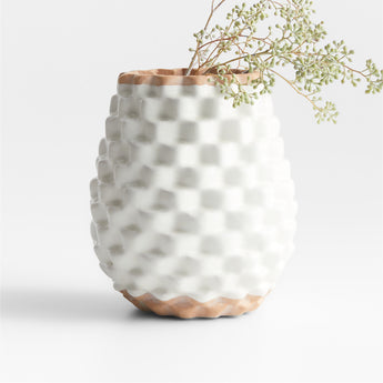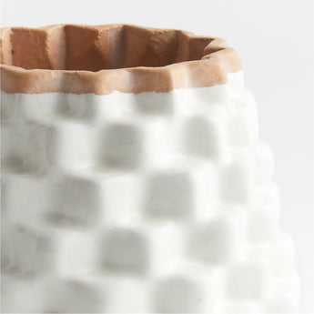 El esmalte blanco brillante aporta un enfoque nítido al diseño de chevron profundamente grabado, combinando un diseño atrevido con ramos de flores llenos de color. El elegante jarrón en forma de botella muestra sus raíces artesanales en el diseño rústico tallado a mano y el borde y la base de arcilla vista.