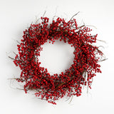 Ramitas de bayas falsas enrollan una gran corona añadiendo color festivo encima de una chimenea o como acogedora decoración de pared en el vestíbulo.