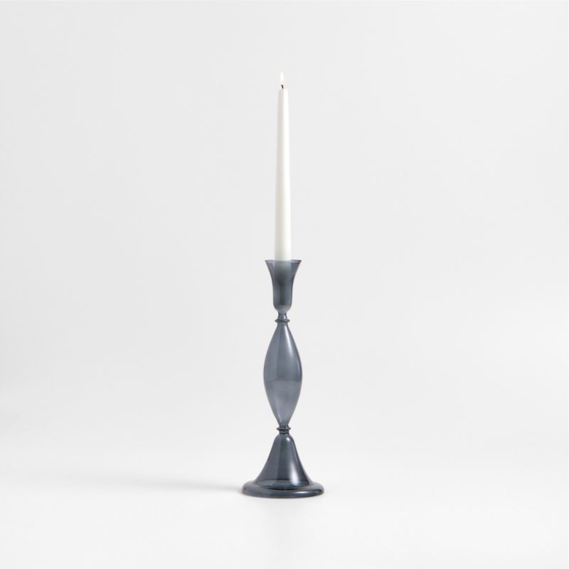 Milano reimagina los candelabros vintage, actualizando las siluetas ornamentadas con curvas aerodinámicas enCristal indigo con un efecto impresionante. Soplado a mano por artesanos expertos, este gran candelabro de curvas intrincadas culmina en una copa alargada que soporta una vela cónica o sirve de florero para capullos. El moderno tinte gris azulado resplandece con humor a la luz de las velas. Exhiba esta pieza sutilmente juguetona en solitario para conseguir un aspecto escultural, o colóquela en capas con otros exclusivos portavelas Milano Cristal de distintas alturas y tonalidades para conseguir un efecto más ecléctico y extravagante.