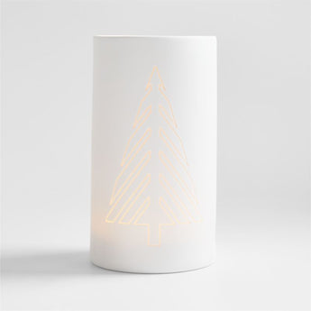 Moderno y lineal, el recorte de un pino deja entrever la luz de las velas a través de nuestra hélice de porcelana blanca mate. Un cálido resplandor fluye de los recortes angulares, creando un brillo invernal sobre la repisa de una chimenea, una consola de entrada o un bufé. Distribuya o agrupe el portavelas de árbol de Navidad grande con múltiples de los tamaños más pequeños a juego para crear un centro de mesa nevado en la mesa de comedor navideña.