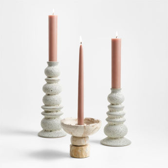 Lleve el atrevido aspecto de las velas de pilar a sus candelabros de velas cónicas. Más pequeñas en la base, las velas se adaptan fácilmente a los candelabros diseñados para velas cónicas. Fabricadas con cera sin perfume en un tono peonía, las velas desprenden una elegancia discreta que resulta ideal para una mesa de comedor refinada o rústica. En un cálido rosa empolvado que recuerda a los pétalos de flores prensados, las velas complementan las modernas piezas románticas de nuestra exclusiva colección Laura Kim.