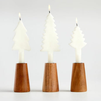 Los abetos cubiertos de nieve encantan en forma de vela, llevando la belleza del paisaje escarchado al interior. Representando tres siluetas diferentes de árboles de hoja perenne, las tres velas sin aroma encajan en portavelas cónicos estándar. Dispóngalas entre los deliciosos platos de su mesa de comedor, o agrupe el trío en su repisa o bufé para añadir encanto navideño y luz parpadeante a su decoración invernal. Este juego de tres velas con forma de árbol de abeto es una exclusiva Crate and Barrel .