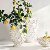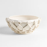 Engañando a la vista con su exquisita artesanía, nuestro cuenco para centro de mesa Corda imita el aspecto de las vasijas rústicas envueltas en cuerda. Hábiles artesanos retuercen y tejen espirales de arcilla formando una "cuerda" realista, y luego la unen al cuenco hecho a mano para crear el tejido de rombos abiertos de una red. La pieza en trampantojo se sumerge en un vidriado blanco cremoso para conseguir un aspecto clásico que mantiene toda la atención en el intrincado adorno. Tanto si se exhibe solo como una elegante escultura o amontonado con plantas de temporada, cada cuenco Corda es único en su especie.