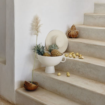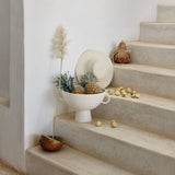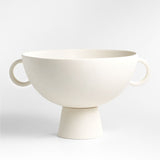 Eleve piñas, conchas marinas y otros elementos botánicos y de relleno de temporada en nuestro cuenco para centro de mesa Nerida, de tamaño espectacular. Encaramado sobre una base cónica, el elegante cuenco evoca la silueta de una copa romana en loza esmaltada en blanco cremoso. Las asas en bucle completan la suave geometría del cuenco de curvas limpias y le invitan a recolocarlo más allá de la mesa de comedor. Nuestro bol de centro de mesa con pie blanco Nerida es una exclusiva de Crate & Barrel.