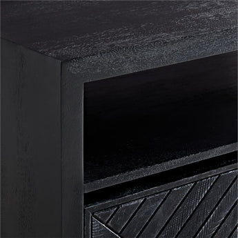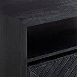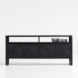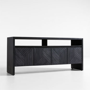 Empleando la técnica consagrada de la parquetería, hábiles ebanistas añaden rusticidad artesanal a nuestro aparador Dunewood, limpio y contemporáneo. Aportando complejidad geométrica a las puertas de frente plano del aparador, cada pieza de madera de mango está cuidadosamente cortada e incrustada a mano para crear un moderno mosaico de líneas angulosas. El cepillado y el acabado ebonizado dan al aparador un aspecto atrevido y rústico. Diseñado por Blake Tovin de Tovin Design, el aparador cuenta con una estantería abierta y dos baldas interiores.