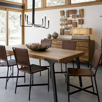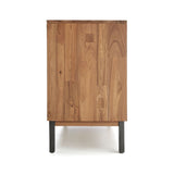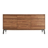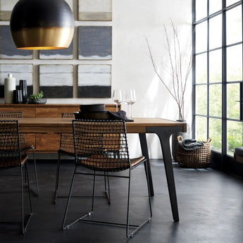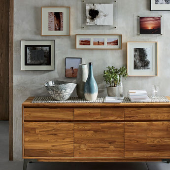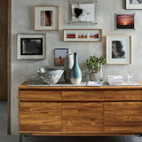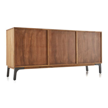 Lakin da un propósito moderno a la teca reutilizada como llamativo aparador, lijándola, puliéndola y encerándola hasta conseguir un hermoso brillo. El refinado diseño proporciona un generoso almacenamiento detrás de cajones y puertas con tiradores ocultos, creando un aspecto aerodinámico que muestra el variado color y la rica veta de la madera. Las patas metálicas, envejecidas para que parezcan de hierro fundido, aportan un acento de material mixto, arqueándose a la perfección en la base de la credenza. ^ Cada puerta oculta un estante extraíble. La credenza Lakin es una exclusiva Crate and Barrel .