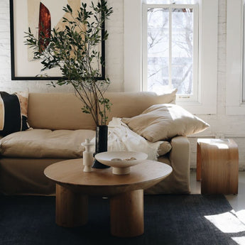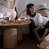 Nuestra mesa de centro Tom, que da que hablar, deleita con proporciones inesperadas y una geometría juguetona. Unos cilindros sobredimensionados sustituyen a las esbeltas patas de la mesa, sosteniendo un tablero que parece un trozo de una esfera gigante. Fabricada con chapa de roble, la mesa de centro tiene un acabado natural que aviva la escultural silueta con vivas vetas de madera. Nos encanta la mesa Tom combinada con otras formas atrevidas, texturas divertidas y líneas gráficas de nuestra exclusiva colección diseñada por Leanne Ford.
