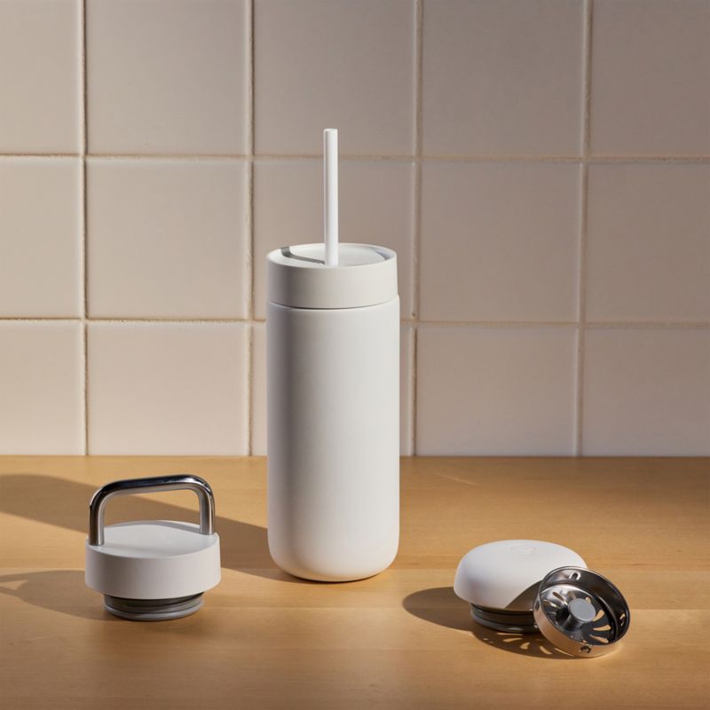 Una taza de viaje digna de su mejor café pour-over o cold brew. Fellow reimagina el vaso para llevar como un recipiente maravillosamente sencillo con tres variantes de tapa diseñadas para optimizar su experiencia de tomar café. El interior revestido de cerámica de la taza Carter conserva el auténtico sabor del café, y el aislamiento al vacío de doble pared de acero inoxidable mantiene las bebidas calientes calientes durante 12 horas y las frías durante un día entero. Acabado en un moderno blanco mate, el vaso redondeado garantiza una placentera pausa para el café esté donde esté y nunca goteará por el camino. Cúbralo con la tapa Move Lid con protección contra salpicaduras para mantener el contenido caliente, la tapa Cold Lid con pajita resistente a salpicaduras para sorber café frío, té o bebidas de frutas que se mantienen frías, o la tapa Carry Lid con asa metálica para transportarlo fácilmente. Este lote en caja es un regalo perfecto para los amantes del café.