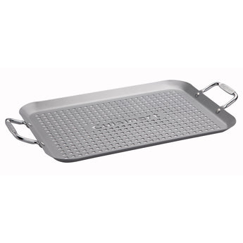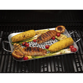 - El Cuisinart® La bandeja antiadherente para parrilla de 14,5" x 10" ayuda a cualquier aficionado a la parrilla a cocinar una gran variedad de alimentos delicados en la parrilla sin que se caigan por la rejilla. Ideal para pescados, mariscos y verduras, esta bandeja de diseño inteligente presenta una gran superficie de asado de 14,5" x 10" y una superficie perforada para realzar los sabores naturales de la parrilla creados por la llama abierta. El material con revestimiento antiadherente es apto para temperaturas de hasta 400°F. y es esencial para cualquier aficionado a la parrilla. Tiene cuatro lados elevados que evitan que los alimentos caigan en la rejilla y dispone de asas de acero inoxidable que facilitan su traslado de la parrilla a la mesa de preparación.