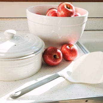 Reúnase para un copioso desayuno o cena de tortitas con un montón de tortitas humeantes mantenidas calientes para servir. Hecha a mano por hábiles artesanos portugueses, la fuente de gres acanalado, apta para el horno y la mesa, está esmaltada con un glaseado de crema blanquecina que le da un encanto de granja lechera. La tapa está perforada para permitir la ventilación del vapor y evitar así que las tortitas queden empapadas.