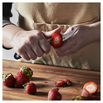 - El cuchillo afilado con precisión de ZWILLING es un utensilio de cocina de uso diario. La hoja procesada de alta calidad con su forma curvada es especialmente adecuada para pelar diversos tipos de frutas y verduras. Con el mango estable y ergonómico de plástico negro, se garantiza un manejo seguro y cómodo.