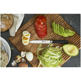 - El cuchillo universal de la serie FOUR STAR destaca por su probado diseño clásico, su mango ergonómico y su comodidad durante el uso. Este cuchillo de tamaño medio con una hoja de 13 cm ofrece una gran variedad de usos. El filo dentado convierte al cuchillo universal en un auténtico todoterreno en la cocina. Corta fácilmente fiambres, queso o rodajas de tomate y es especialmente adecuado para preparar aperitivos y platos fríos. El acero inoxidable utilizado para la hoja es resistente al óxido, lo que hace que el cuchillo sea fácil de limpiar, fuerte y duradero. La hoja de FRIODUR se ha perfeccionado mediante un proceso especial de endurecimiento en frío, lo que garantiza que la hoja sea extremadamente afilada, resistente a la corrosión y flexible. El manejo del cuchillo es sencillo gracias a la transición sin juntas entre el cabezal y el mango. El cuchillo SIGMAFORGE está forjado a partir de una sola pieza de acero, lo que garantiza una geometría óptima y excelentes propiedades de corte. El cabezal proporciona el equilibrio perfecto a la vez que actúa como protector de los dedos, minimizando el riesgo de que la mano resbale del mango a la hoja. El cuchillo universal ZWILLING es una valiosa herramienta en la cocina por su amplia gama de usos y su agarre seguro.