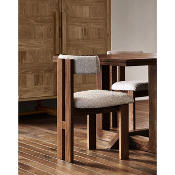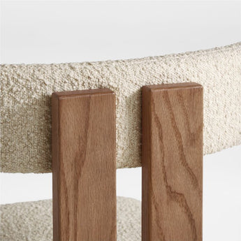 Llamada así por el importante ritual de compartir las comidas juntos, nuestra silla Ceremonie invita a quedarse alrededor de la mesa con comodidad y aspecto desenfadado. La silla reimagina la clásica y moderna silla wishbone con un perfil sin brazos, líneas verticales y una llamativa estructura de respaldo de doble viga. El armazón de roble está cepillado con un acabado marrón avellana para resaltar las bellas vetas de la madera. El asiento tapizado y el respaldo en forma de U ofrecen confort con un acolchado de espuma y un tejido bouclé texturizado en avena neutra.