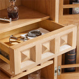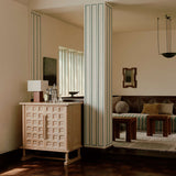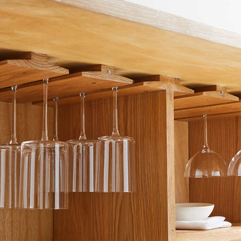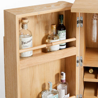 Nuestro mueble bar Honore, un sueño para los entusiastas de los cócteles, sorprende por su extraordinaria elaboración y su aire moderno-vintage. Fabricado en roble y chapa de roble, el mueble abunda en detalles bien elaborados que se aprecian en los sutiles detalles de las crestas, los soportes de las barras camilla y las puertas gloriosamente artesonadas. Largos tiradores verticales se abren a un interior totalmente equipado, con botelleros en las puertas interiores, un estante superior para almacenar vino Cristal , estantes fijos y ajustables, y un pequeño cajón para las herramientas del bar. Incluso la altura del mueble fue cuidadosamente considerada, escalada para su uso como superficie de barra o zona de servicio o para estilizarlo encima con libros, una lámpara de mesa o un jarrón.