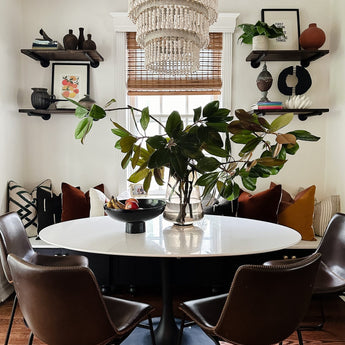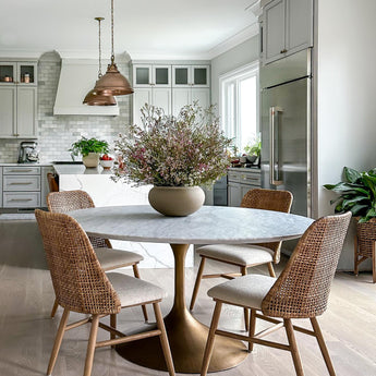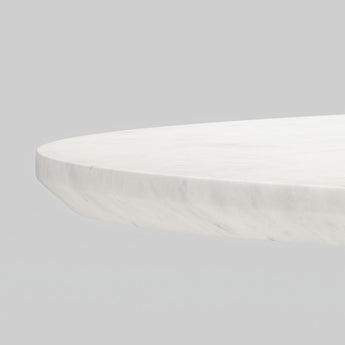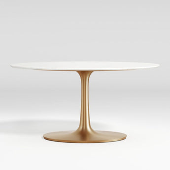 Nero curva el modernismo de mediados de siglo en una nueva dirección, mezclando metal y mármol en un diseño ovalado con visión de futuro. Un óvalo de prístino mármol blanco remata una amplia base en forma de trompeta de hierro acabado en reluciente brass. Distinguida por un veteado que es único en cada mesa, Nero tiene capacidad para cuatro personas para el brunch, la cena y la noche de juegos. ^ La mesa de comedor ovalada de mármol blanco Nero con base de brass es una exclusiva de Crate & Barrel.