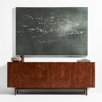 Nuestra impresión giclée de la fotografía original capta una bandada de pájaros alzando el vuelo. Apareciendo como motas de blanco contra un cielo oscuro de tonos verdes profundos y modulados, la formación de vuelo adquiere una cualidad abstracta que confiere a esta obra su toque contemporáneo. Cada impresión se presenta en un marco flotante de madera con acabado natural.