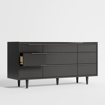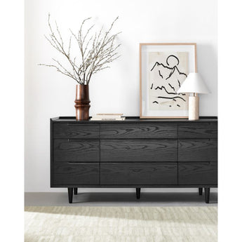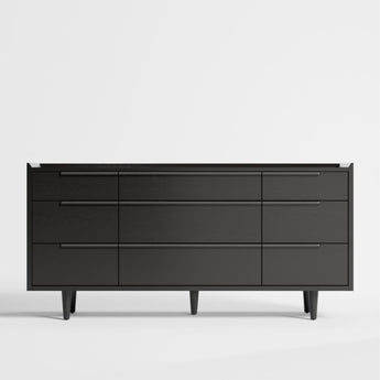 Nuestra colección Tate, inspirada en los años 60, evoca la atemporalidad del diseño de mediados de siglo con perfiles entallados y formas aerodinámicas. Fabricada en fresno y chapas de madera noble acabadas en negro, la cómoda presenta un frente continuo con nueve cajones de tamaño variable con frentes de galería de diseño, tiradores lineales socavados y patas cónicas torneadas. Diseñada por Blake Tovin, la cómoda de nueve cajones Tate es una exclusiva de Crate & Barrel.
