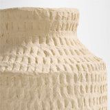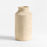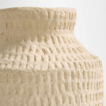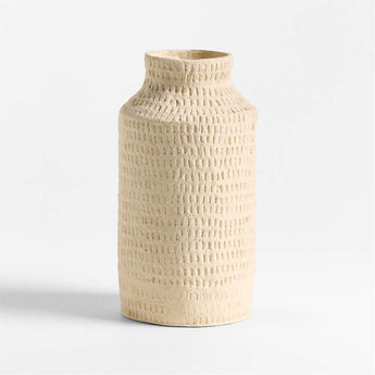 Nuestra colección Oaxaca transforma los retales de tela en majestuosos jarrones de calidez orgánica. Hábiles artesanos prensan la pulpa de tela en una forma cilíndrica, que luego se pinta a mano con un cálido acabado blanco roto. Hileras de guiones incisos texturizan la vasija con interés rústico. Fascinante por sí solo, el jarrón alto también constituye una hermosa presentación de plantas botánicas secas y de imitación.
