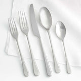 Esbelta a la moda y muy pulida. Las formas esbeltas y fluidas de nuestra cubertería Tour están estampadas y forjadas en acero inoxidable y acabadas en espejo para un mayor brillo. Este juego de cubiertos de cinco piezas incluye un tenedor de ensalada, un tenedor de mesa, un cuchillo de mesa, una cuchara de mesa y una cuchara de té. Diseñado por Robert Welch en exclusiva para Crate and Barrel, este juego combina perfectamente con nuestras piezas de servicio Tour.