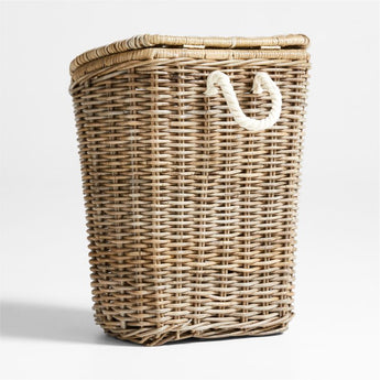 Trenzas gruesas de mimbre de ratán rústico lavado se entretejen intrincadamente alrededor de un armazón de hierro en nuestra cesta Poplar de Leanne Ford, lista para acorralar la colada o la ropa de cama extra. Un asa robusta en la parte trasera facilita su transporte al lavadero, mientras que su perfil vertical permite guardarla en armarios o rincones.