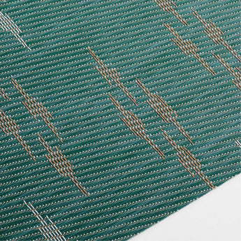 Formas verticales en marrón tonal danzan sobre un fondo verde salvia con un tejido diagonal en este mantel individual de Chilewich de patrón dinámico. Cada mantel individual está tejido con hilos de PVC tratados con TerraStrand, un compuesto patentado que no contiene ftalatos y contiene compuestos vegetales renovables que sustituyen a los plastificantes derivados del petróleo utilizados para ablandar los hilos. La protección antimicrobiana Microban protege el corredor contra las bacterias, el moho y los hongos que causan manchas y olores.