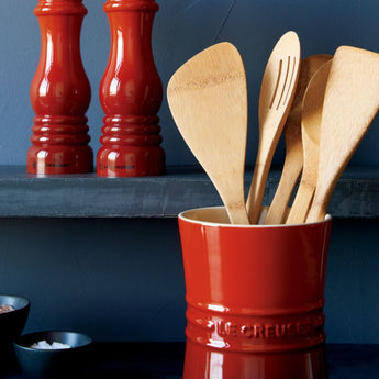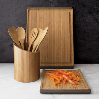 Los utensilios de bambú se fabrican a mano a partir de un único tallo y se bruñen hasta conseguir un acabado suave y satinado. Más resistentes que la madera, no dañan los utensilios de cocina ni absorben olores o sabores. El juego incluye dos volteadores, dos cucharas de madera para cocinar y una espumadera.