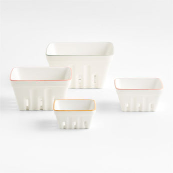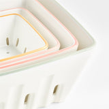 La clásica caja de bayas del mercado agrícola se reimagina en cerámica como un acento de cocina encantador y funcional. Los cuatro escurridores de gres de nuestro juego están esmaltados en blanco brillante y pintados a mano a lo largo del borde en una paleta alegre pero sofisticada de amarillo dorado, muted teal y dos tonos de rosa. Utilice las caprichosas cajas para enjuagar fresas, arándanos y frambuesas frescas; también son un dulce complemento para la mesa del desayuno o el bufé del brunch repleto de fruta. Para una cocina coordinada en modernos tonos primaverales, combine el juego apto para lavavajillas con las demás piezas de nuestra exclusiva colección Bloom.