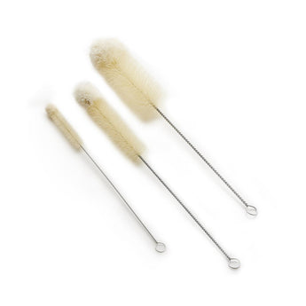 Estos cepillos cuidadosamente diseñados en tres tamaños combinan resistentes cerdas de cerdo y suave lana para frotar y fregar en el interior de botellas y otros recipientes de cuello estrecho como copas de champán, vinagreras y floreros de capullos. Los mangos son de alambre de acero inoxidable con una anilla de conexión.