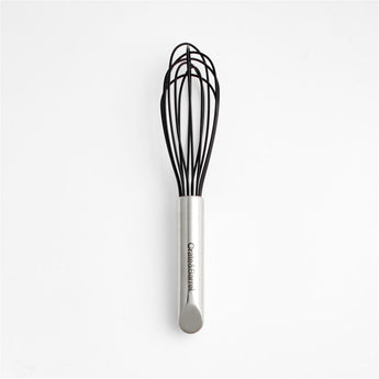 Bata tandas de claras de huevo, adobos y nata montada con nuestro característico batidor de silicona negra y acero inoxidable. Recubierto de silicona negra, el cabezal de acero inoxidable mezcla hábilmente los batidos más espesos o dobla los merengues más delicados mientras sus flexibles púas raspan el bol o la sartén perfectamente limpios. La silicona de tacto suave no daña los utensilios de cocina antiadherentes y resiste las manchas, los arañazos y el calor hasta 600 grados. El acero inoxidable pulido da forma a un elegante mango cilíndrico para un agarre firme y un aspecto profesional. Nos encanta la forma en que el refinado borde biselado remata el mango alargado con un detalle dinámico. Combine el batidor pequeño apto para lavavajillas con los demás utensilios de exquisitas proporciones de nuestra exclusiva colección Crate & Barrel para tener un espacio de trabajo bien equipado a la altura de cualquier reto culinario.