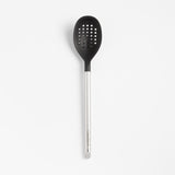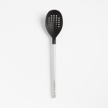 Remueva, recoja y sirva albóndigas, pasta y guisantes con nuestra característica cuchara ranurada honda de silicona y acero inoxidable. Fabricada con un núcleo de nailon para mayor resistencia, la cuchara de doble capacidad tiene el tamaño adecuado para remover y servir, con perforaciones que permiten escurrir los líquidos. La silicona suave al tacto no daña las sartenes antiadherentes y resiste las manchas, los arañazos y el calor hasta 600 grados. El acero inoxidable pulido da forma a un elegante mango cilíndrico para un agarre resistente y un aspecto profesional, y un refinado borde biselado remata el mango con un detalle dinámico. Combine la cuchara de ranuras profundas apta para el lavavajillas con los demás utensilios de exquisitas proporciones de nuestra exclusiva colección Crate & Barrel para tener un espacio de trabajo bien equipado a la altura de cualquier reto culinario.
