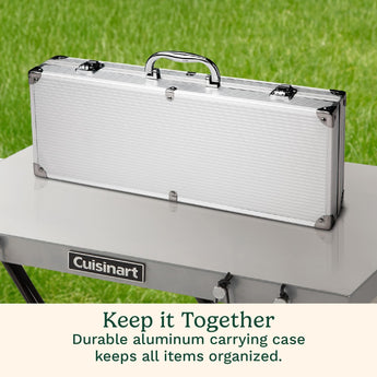 Domine su parrilla con el Juego de utensilios de parrilla de lujo de acero inoxidable de 14 piezas Cuisinart. Esta colección premium de accesorios para asar está hecha para barbacoas en el patio trasero, tailgates y cookouts. Diseñado para la comodidad y el rendimiento, este juego de utensilios para parrillas Exterior incluye todo lo que necesita: una espátula de chef, pinzas con cierre, cepillo para parrilla y cabezal extra, y ocho soportes para maíz. Los utensilios para la parrilla cuentan con mangos de acero inoxidable y anillas colgantes para un acceso fácil y seguro mientras cocina. Ya esté volteando hamburguesas, pincelando costillas con adobo o sirviendo maíz, este kit de accesorios para barbacoa le tiene cubierto. Guarde todos sus utensilios de barbacoa de forma ordenada en la resistente bolsa de transporte de aluminio y estará listo para empezar. Este juego de utensilios para la parrilla es perfecto para asar en casa o para llevar de viaje.