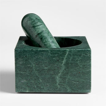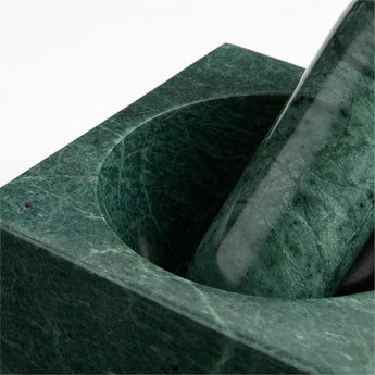 Inspirado en la intersección de formas básicas, Daniel Humm diseñó este mortero y pilón funcional como una pieza de alto diseño. La atrevida base cúbica ofrece una hendidura redonda con amplio espacio para hierbas, especias, frutos secos y mucho más, mientras que el mortero en forma de cápsula proporciona un agarre ergonómico. Tallado a mano por artesanos expertos, el juego de condimentos armoniza con las demás piezas de mármol verde dignas de exhibición de esta colección exclusiva que eleva los elementos esenciales para cocinar, comer y servir.